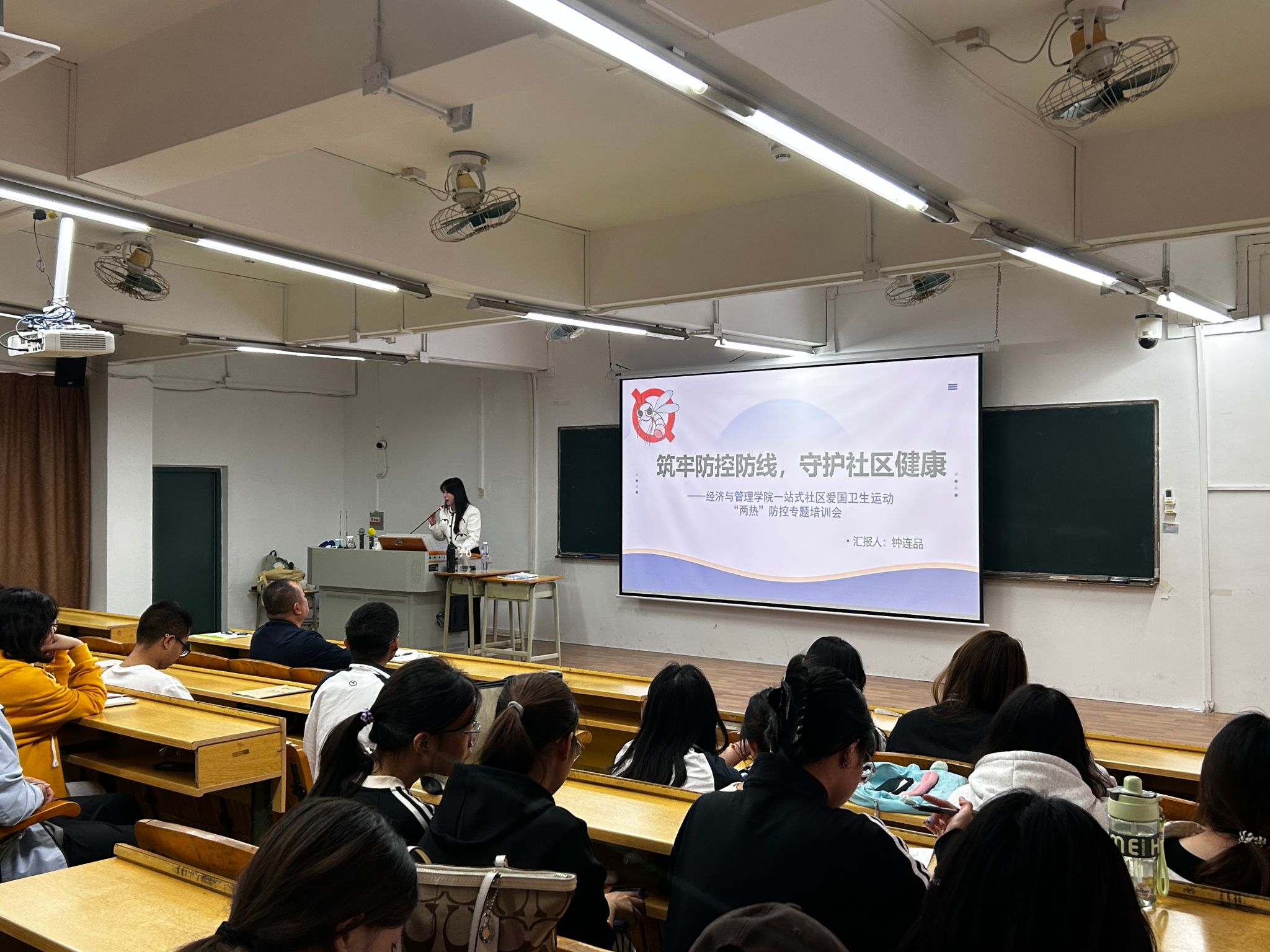 为了深入落实爱国卫生运动中公共卫生安全保障要求,切实守护社区内学生身体健康与生命安全,10月23日,经济与管理学院在1305课室开展一站式社区基孔雅热、登革热“两热”防控专题培训。培训会在学院党委书记、学工副院长欧志勇的领导下召开,学院辅导员钟连品主讲,全体学生宿舍长、各班生活委员、学生干部、党员代表参会。