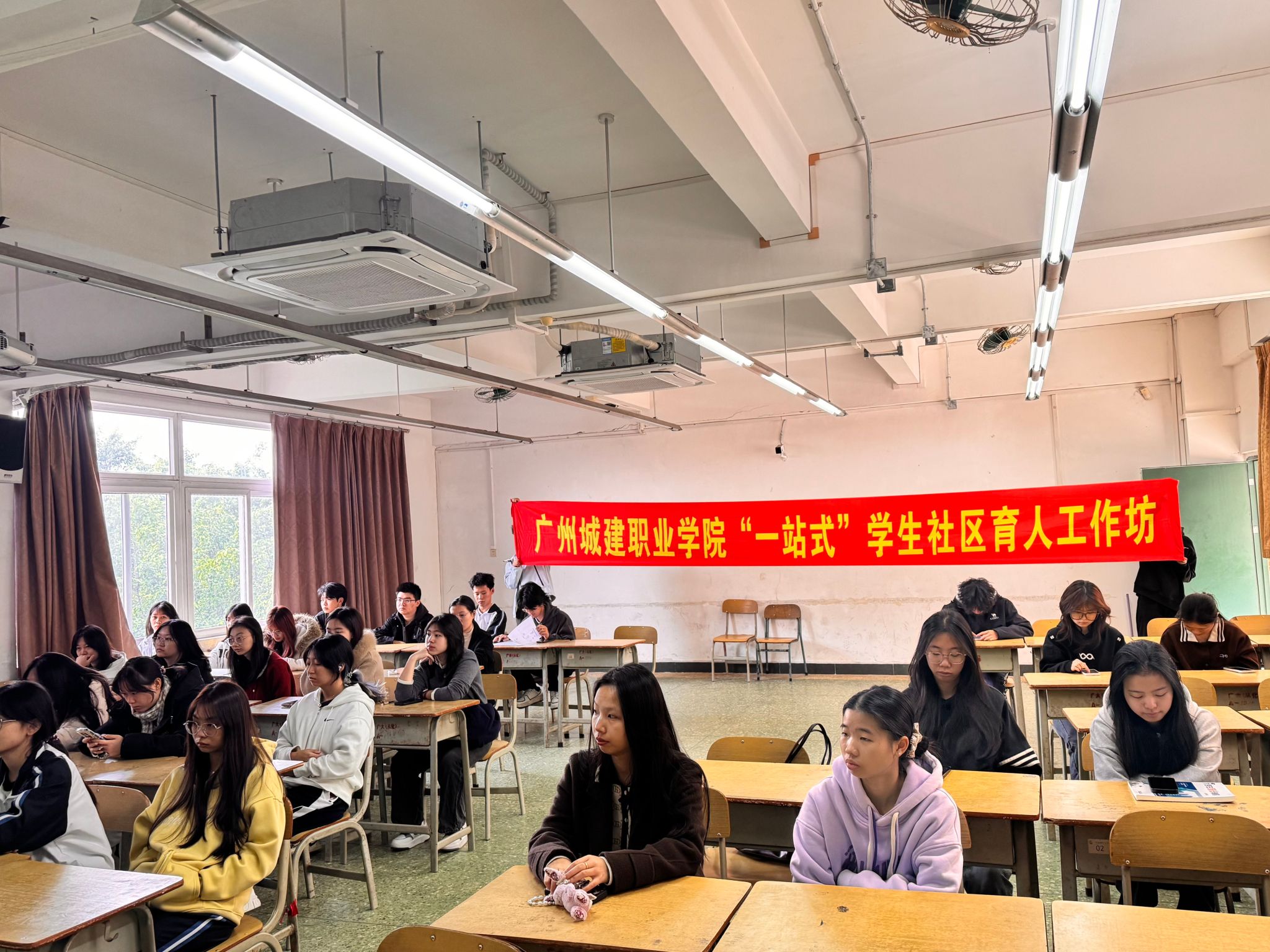 为深入推进“一站式”学生社区建设,强化学生安全意识和思想引领,11月27日下午,15栋学生公寓在人文艺术楼503课室开展“一站式”学生社区育人工作坊。本次工作坊由阮素妍老师主讲,围绕“党的二十届四中全会精神学习”与“消防安全教育”两大主题,为同学们带来一堂生动而深刻的综合素养提升课。