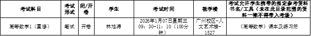 根据学校《[教务通25-175]关于2025-2026学年第一学期期末考试及相关工作安排的通知》要求,本学期广州校区期末考试周统考安排在2026年1月5-12日(第19周周一至第20周周一)进行。学生须持有“双证”(学生证原件和有效身份证原件缺一不可,不可使用证件照片或复印件)方可参加考试,证件不齐一律不得参加考试,学生证丢失的凭“在校证明”代替学生证参加考试。为做好学校考试有关工作,切实将“从严治教、从严治考”落实到位,现将期末考试有关安排通知如下:
