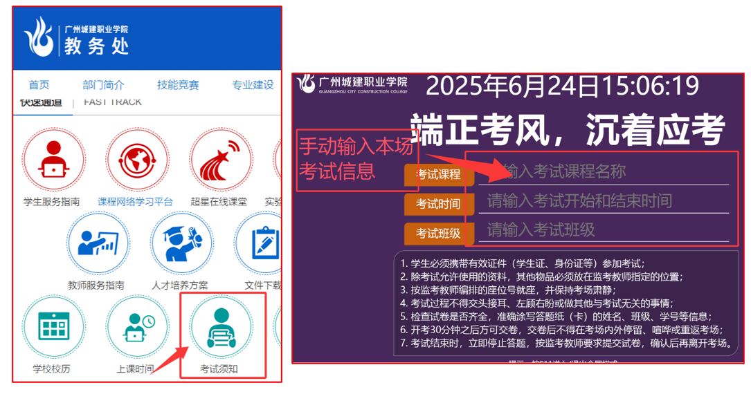 4、监考老师须提前10分钟到达指定的考场,检查考场情况,打开投影仪,启动教师机,在浏览器地址栏输入网址https://jwgl.gzccc.edu.cn/ksxz.htm,进入教务处网站,打开考试须知页面,输入考试课程、时间和班级信息。(或:学校教务处官网→考试须知→输入本场考试信息)