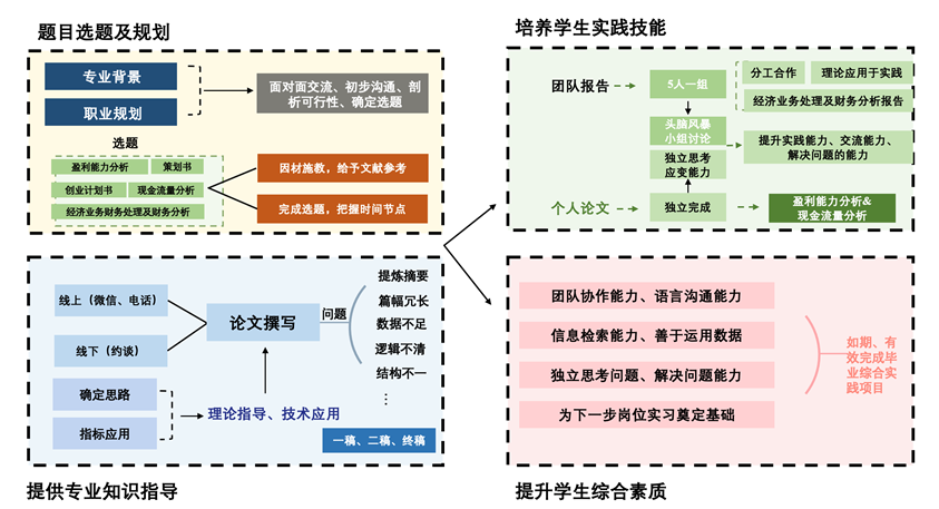 对于选取**公司2022年12月份经济业务财务处理及财务分析的团队,我通过相应的案例选取引导学生如何将理论知识应用于实际项目当中,因此学生在涉及业务处理、明细账、日记账或编制财务报表的环节就不会太迷茫。同时,也针对学生相关指标计算错误等提出问题,便于学生及时修改,帮助学生在实际应用当中提高实践能力和解决问题的能力。那对于其他选取个人项目的同学,针对其财务指标的选取、论文结构体系不当等提出问题,并及时反馈。