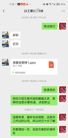 2024年10月8日至11月21日,本人负责2024届工商企业管理2班13名学生的毕业实践综合项目指导工作。工作中,本人因材施教,多管齐下,所有学生均能按时按质按量完成此项工作,并全员参加毕业实践综合项目现场答辩。