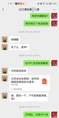 为了完成目标,我首先建了微信群,要求每位学生把昵称改为学号+名字+电话,部分同学添加了私信。每一分项工作,我一般先发公告。公告后没有回应,我就单独@他们。还是没有回应,就在私信里留言,发语音,或者打电话,把工作细化到每一位学生。