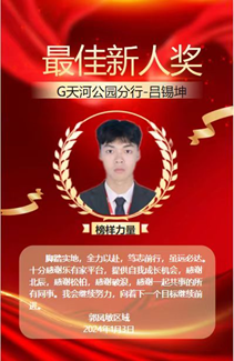 由于工作态度认真,处理业务主动积极,吕锡坤顺利完成了单位实习期的月度考核,被单位评为“优秀新人”,并在大区内部工作群公开表扬。他说那一刻觉得先前的努力都是值得的,受到组织的肯定让他内心受到极大的鼓舞,有足够的信心去做好手头上的工作,并随时准备着接受更大的挑战。