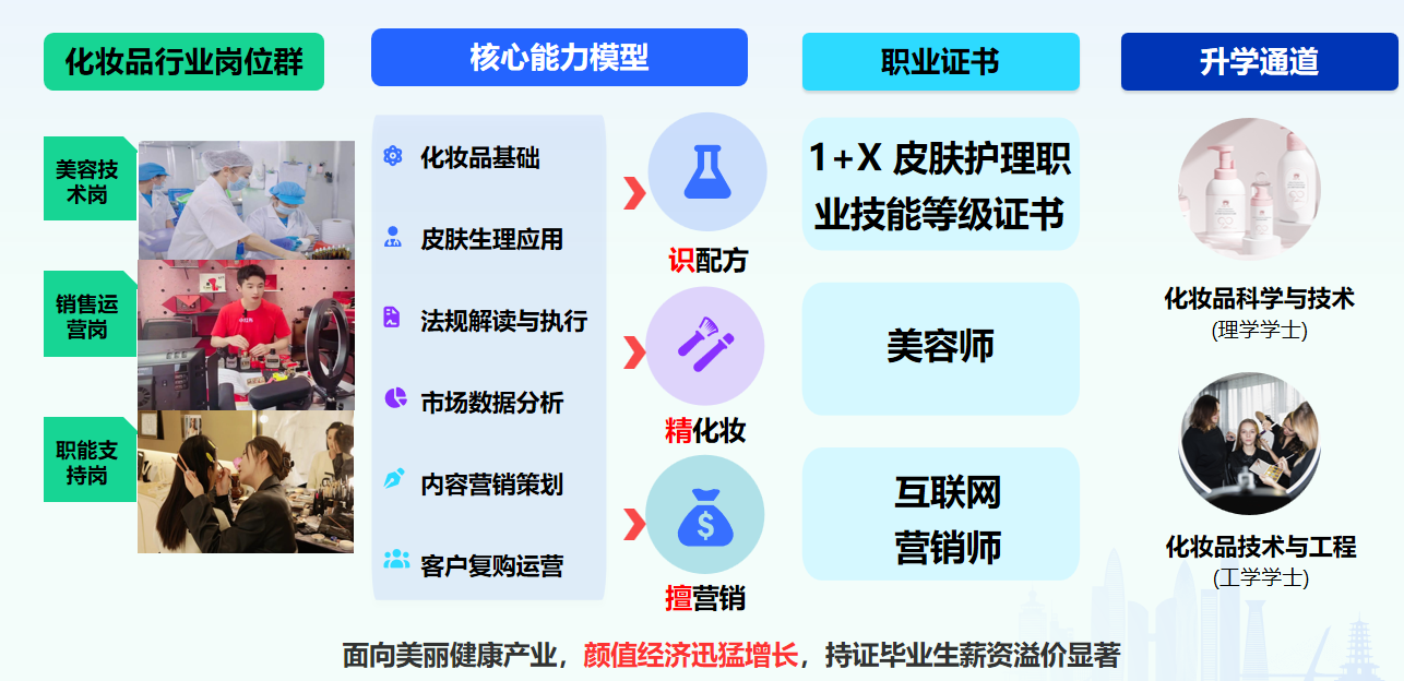 本专业聚焦美丽健康产业发展浪潮,面向颜值经济核心赛道,致力于培养适应新零售环境下化妆品行业需求的复合型应用型人才。学生将系统掌握化妆品配方基础、法规合规管理、数字化运营等核心技能,兼具“识配方、精化妆、擅营销”的综合素养,精通市场数据分析、内容营销策划与客户复购运营逻辑。通过 “岗课赛证” 融合培养,学生可考取皮肤护理职业技能等级证书、美容师、化妆品配方师等权威认证,既能胜任行业一线技术与运营岗位,也可通过升学通道攻读化妆品科学与技术、化妆品技术与工程等本科专业,成为美妆领域兼具专业深度与创新能力的“技术专家”和“运营能手”。
